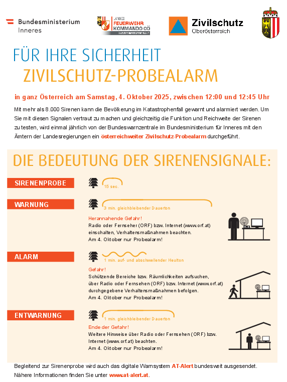 Am ersten Samstag im Oktober, 4. Oktober 2025, wird wieder ein bundesweiter Zivilschutz-Probealarm durchgefĂŒhrt. Zwischen 12:00 und 12:45 Uhr werden nach dem Signal „Sirenenprobe“ die drei Zivilschutzsignale „Warnung“, „Alarm“ und „Entwarnung“ in ganz Österreich ausgestrahlt. Der Probealarm dient einerseits zur ÜberprĂŒfung der technischen Einrichtungen des Warn- und Alarmsystems, andererseits soll die Bevölkerung mit diesen Signalen und ihrer Bedeutung vertraut gemacht werden. In den Medien wird wĂ€hrend der Proben stĂ€ndig informiert.